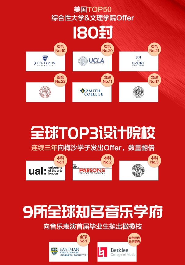 2020申请季还未结束,梅沙学子已收获494封海外名校录取Offer,奖学金累计约合人民币1,960万元,创三年新高。其中,来自美国Top100综合性大学及文理学院的录取通知书有356份,来自美国Top50综合性大学及文理学院的录取通知书有180份。