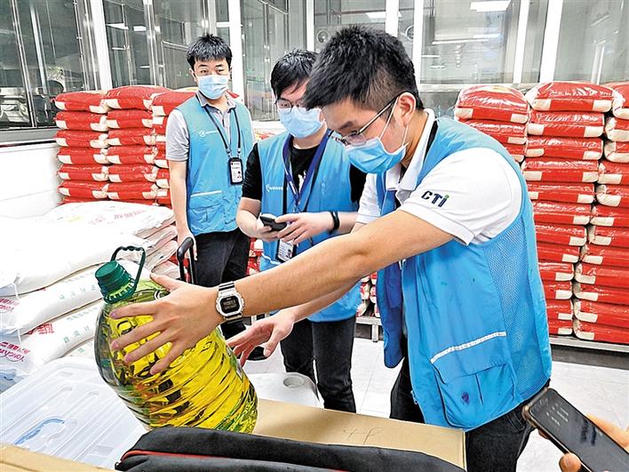 工作人员在学校食堂仓库进行食品原材料抽检。