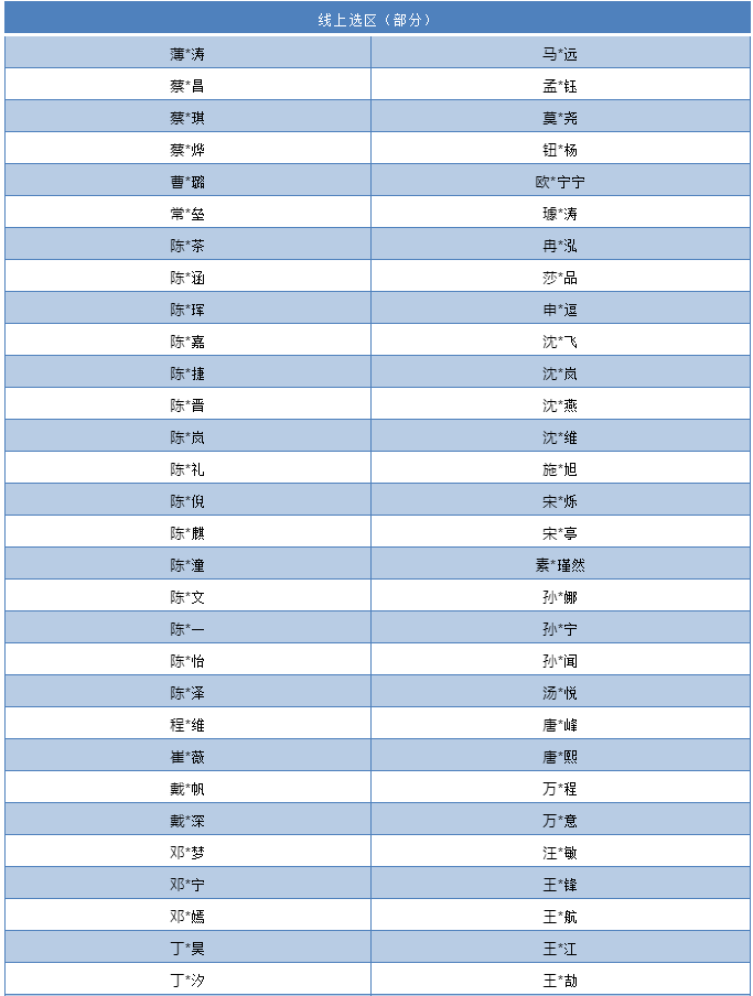 本批公布名单以姓氏首拼排序,排名不分先后,8月仍有晋级名单近期持续公布中。本期公示学生代表名单均为线上报名文友,未包含集体报名参加的学校,以学校集体报名的另行公布。