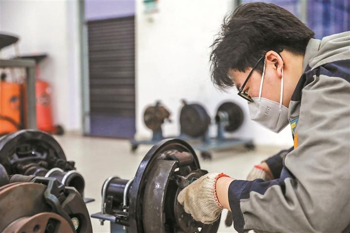 深圳市第二职业技术学校学生参加汽修专业实训。