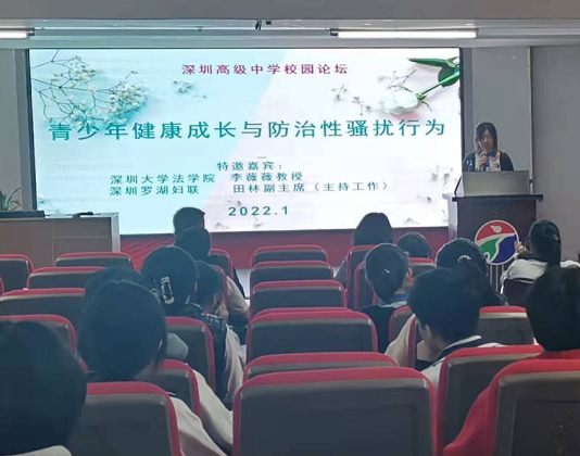 读特客户端·深圳新闻网2022年1月8日讯(记者 陈彬)为进一步加强校园性骚扰防治,推动深圳在“法治城市示范”建设工作上先行示范,1月8日,深圳市高级中学举办“青少年健康成长与防治性骚扰行为”主题论坛,邀请深圳市罗湖区妇联副主席田林、深圳大学法学院李薇薇教授、深圳市高级中学学生代表吴雅涵同学担任主讲,深圳市高级中学国际部高年级同学到场聆听。