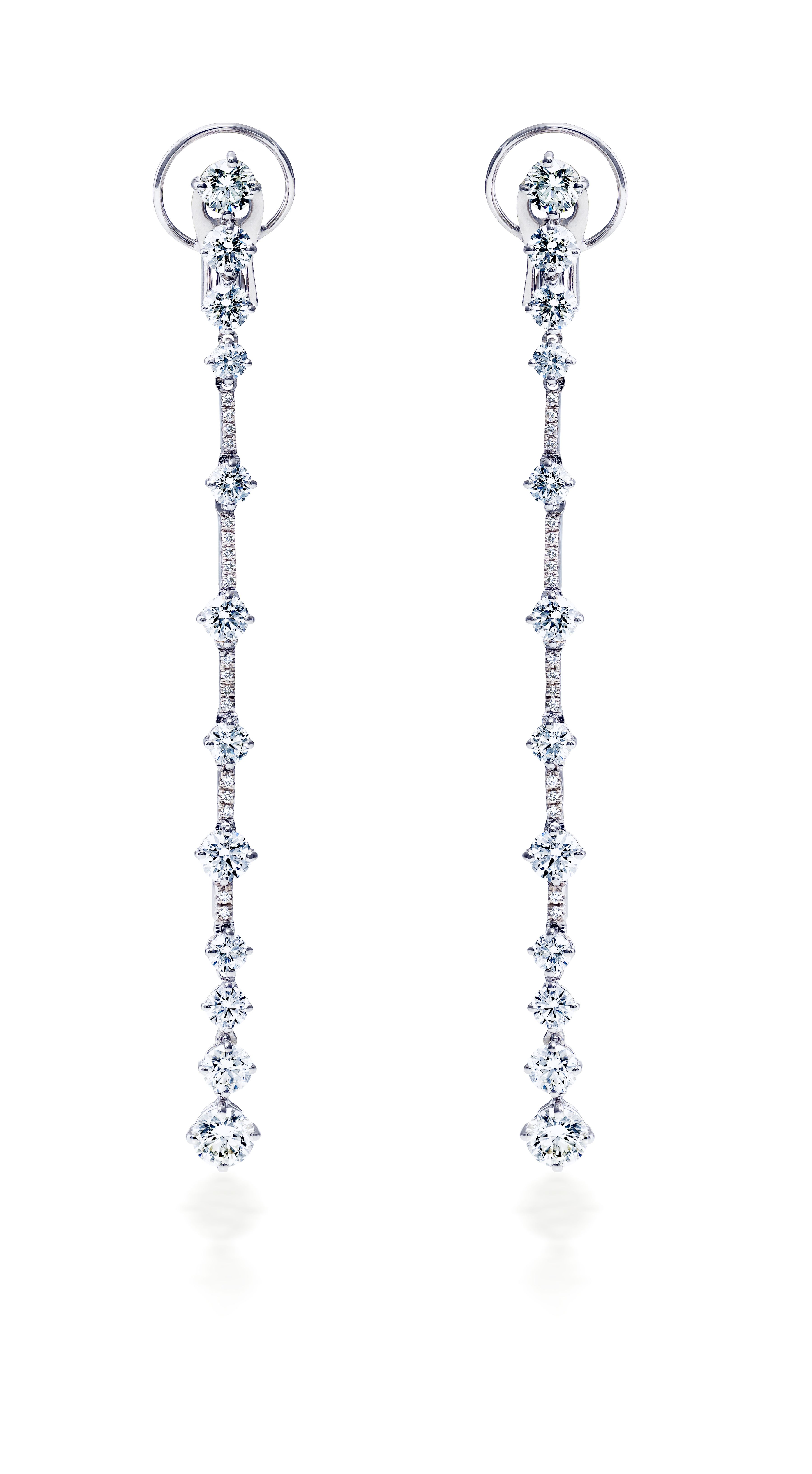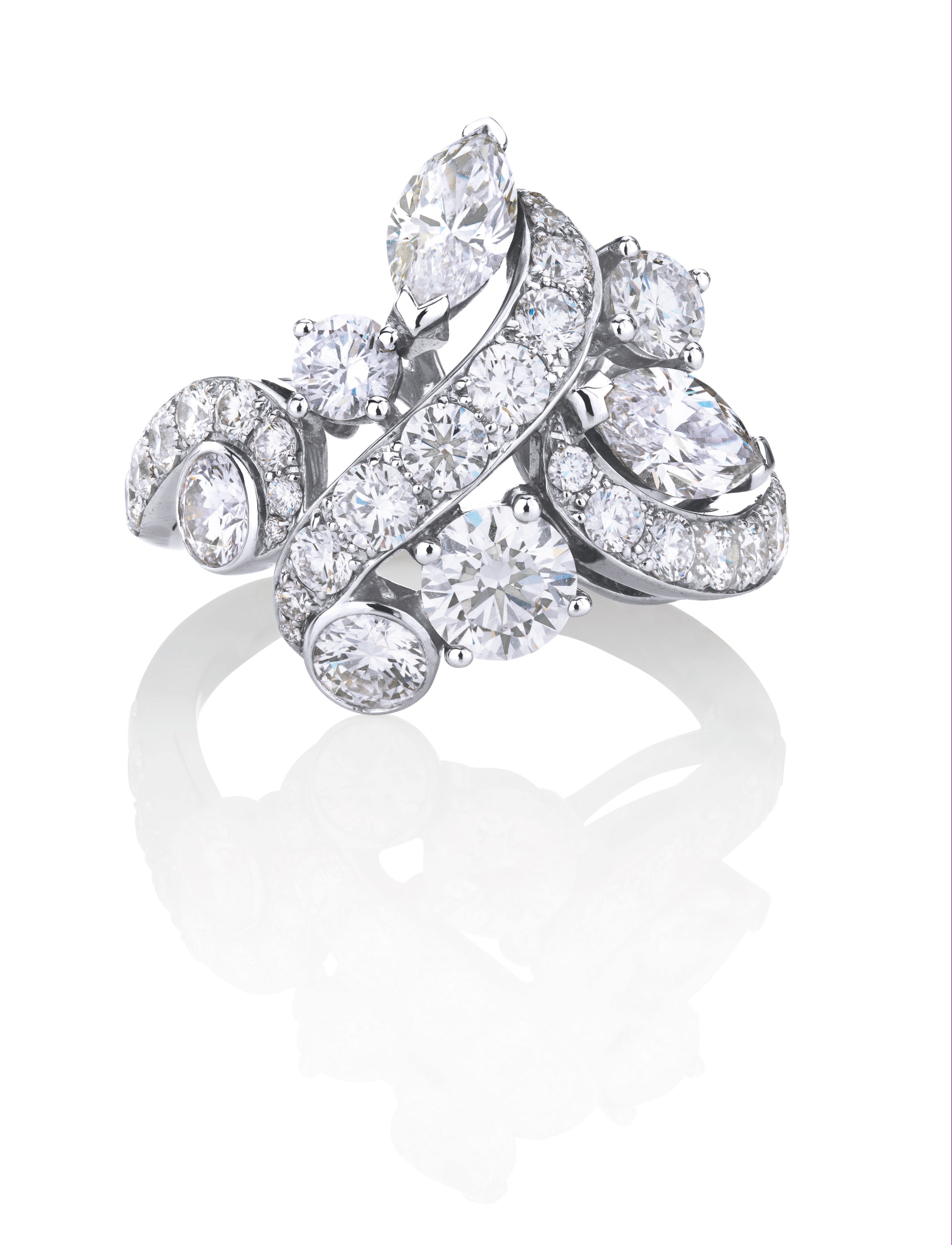 De Beers戴比尔斯 Adonis Rose Cluster戒指 –标志性密镶戒托好似闪光夺目的玫瑰花茎,镶嵌着马眼形和圆形明亮型切割钻石,犹如一场视觉盛宴,十分夺目。总重2.77克拉。De Beers戴比尔斯 Arpeggia单层钻石垂坠耳环 –特选圆形明亮式美钻镶嵌排列于18K白金底座之间,晶莹的钻石闪耀着颤动的光芒,既像悠扬的琶音,又像起舞的精灵。总重4.77克拉。