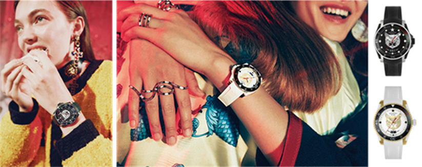 Gucci为其潜水腕表系列新添40毫米及45毫米表款。每款腕表均以经典外观结合品牌全新动物图案。表盘饰以猫头或灵蛇图案,彰显品牌独一无二的风格。同时融合潜水腕表的基础配置,如单向旋转表圈,打造时尚运动风格。