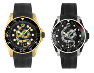 其中一款40毫米表款饰有灵蛇图案,以精钢表壳搭配黑色表盘和黑色橡胶表带,腕表后盖同样镌刻Gucci品牌标识。