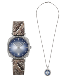 Gucci系列表款将经典造型与设计完美结合。该腕表采用方形圆角精钢表壳,表后盖镌刻方形GG标识。表盘有浅蓝和银两种颜色,饰有Gucci品牌标识及日历视窗,蛇纹皮表带印制蛇皮图案。