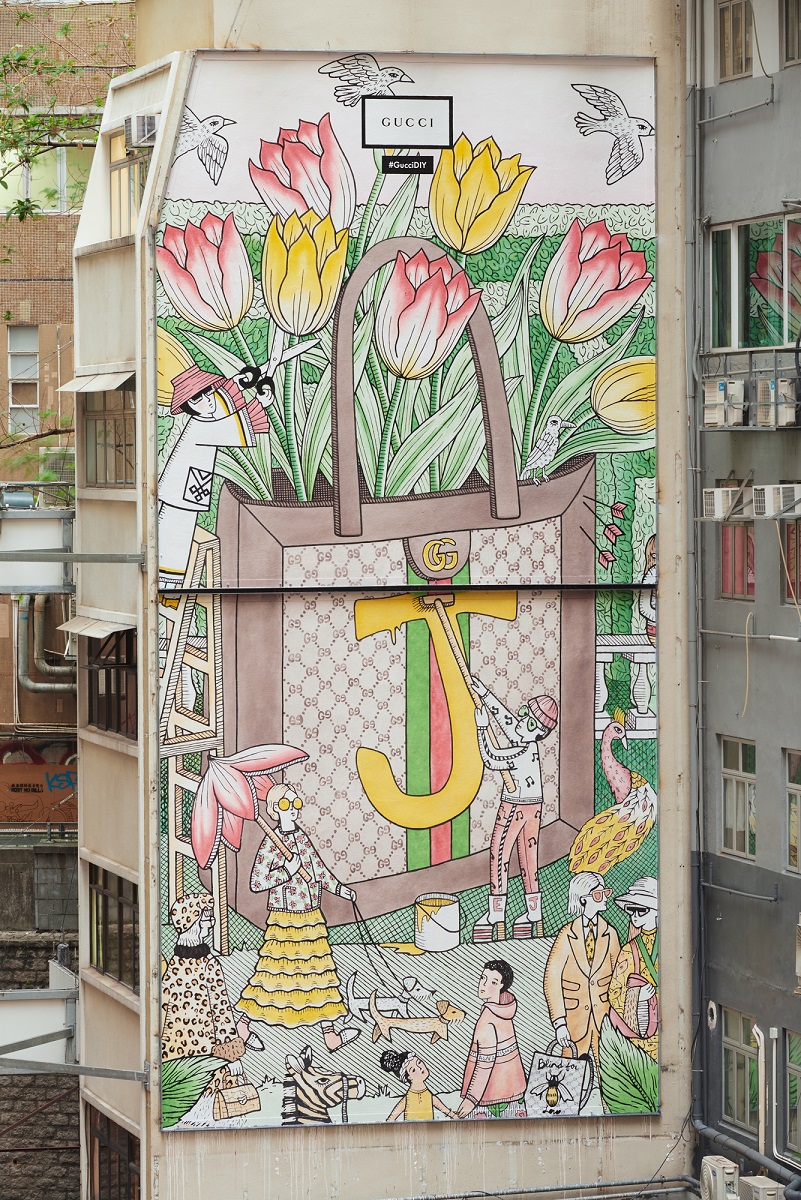多次与古驰进行合作的美国插画家Jayde Fish,此番受邀为上海丰盛里及香港兰桂坊的艺术墙进行创作。她的作品曾出现在2017春夏系列及佛罗伦萨古驰花园内,风格细腻且极富想象力。她将全新的DIY主题艺术墙绘制成花园,当中巨型的Ophidia手袋(上面饰有她的名字首字母J)与画面中身着古驰时装的微型人物相映成趣,形成童话般的氛围。