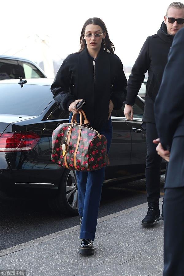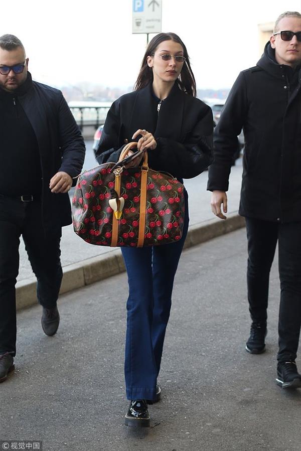 贝拉·哈迪德短夹克喇叭裤手挽SPEEDY机场街拍