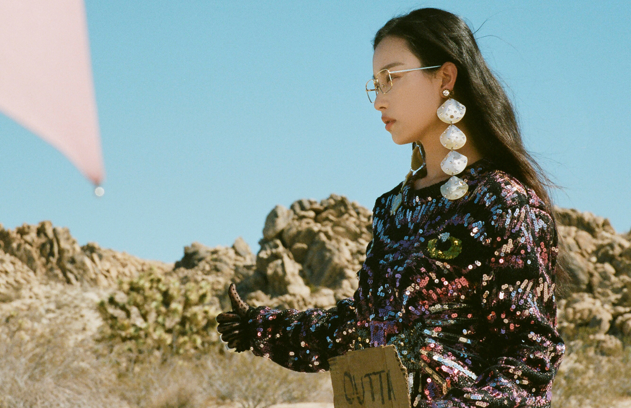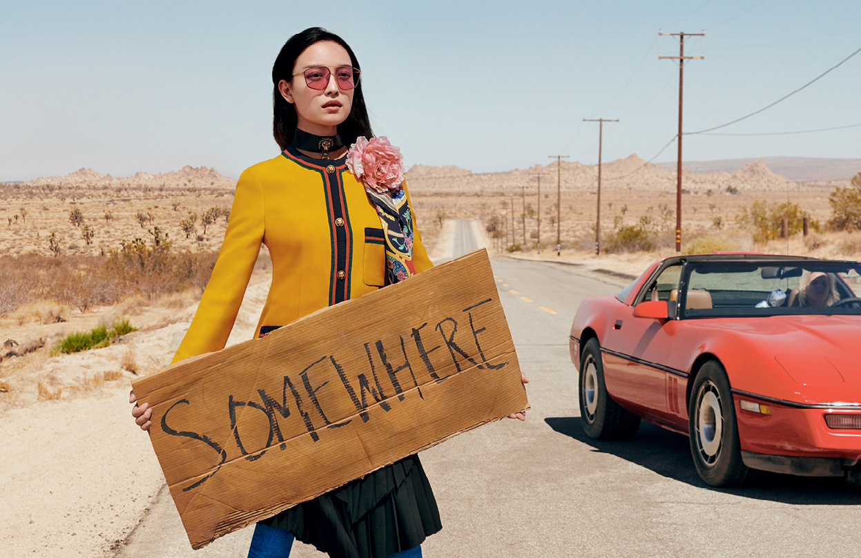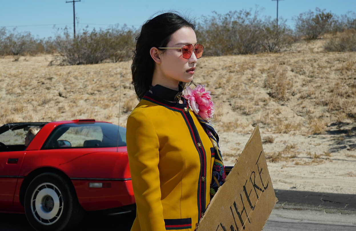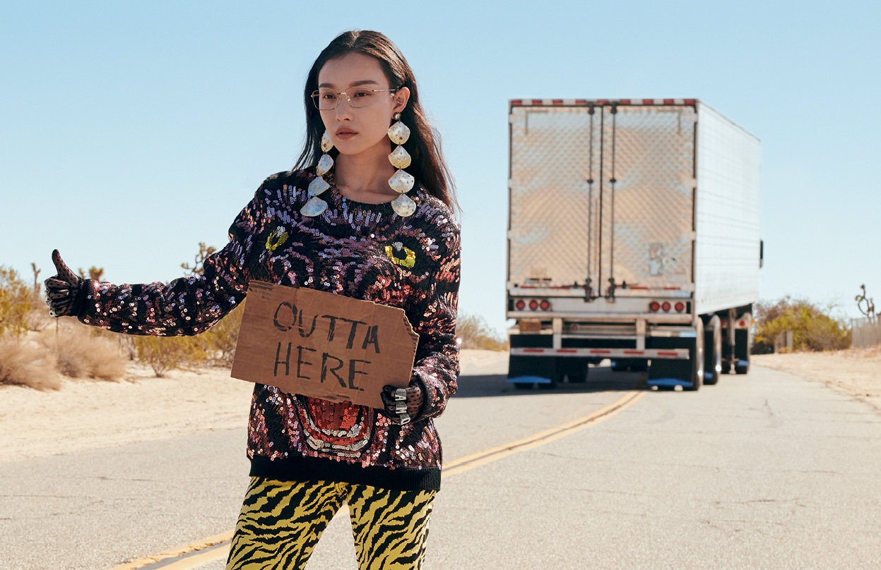 该广告大片由摄影师 Hugo Scott掌镜, Christopher Simmonds担任艺术指导,以电影意象为灵感来源,将天马行空的想象与色彩鲜艳的画面完美结合。炎热的正午时分,倪妮站在空旷的沙漠公路上,手举持有目的地的纸板,“OUTTA HERE (离开此地)”和“SOMEWHERE (前往某地 )”,即将开始说走就走的洒脱之旅。形形色色的车辆在她身边呼啸而过,不期而遇的旅行令人份外期待。宛如置身于公路影片中,倪妮个性鲜明的形象令人过目难忘。