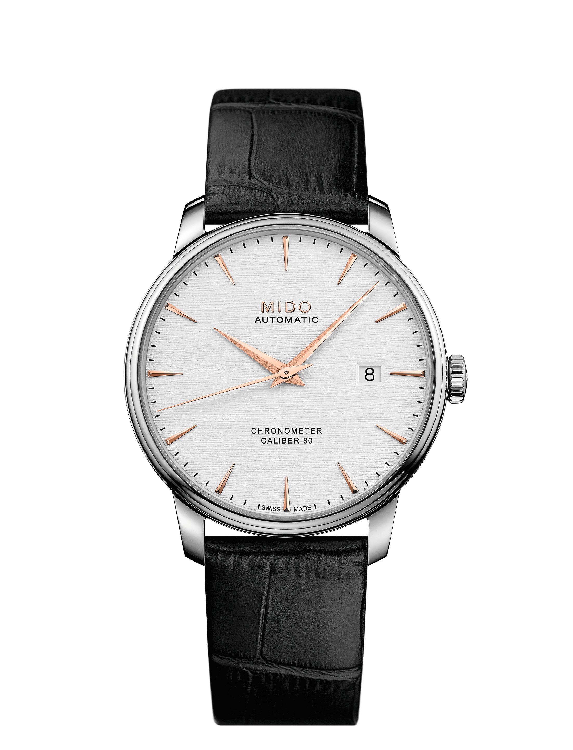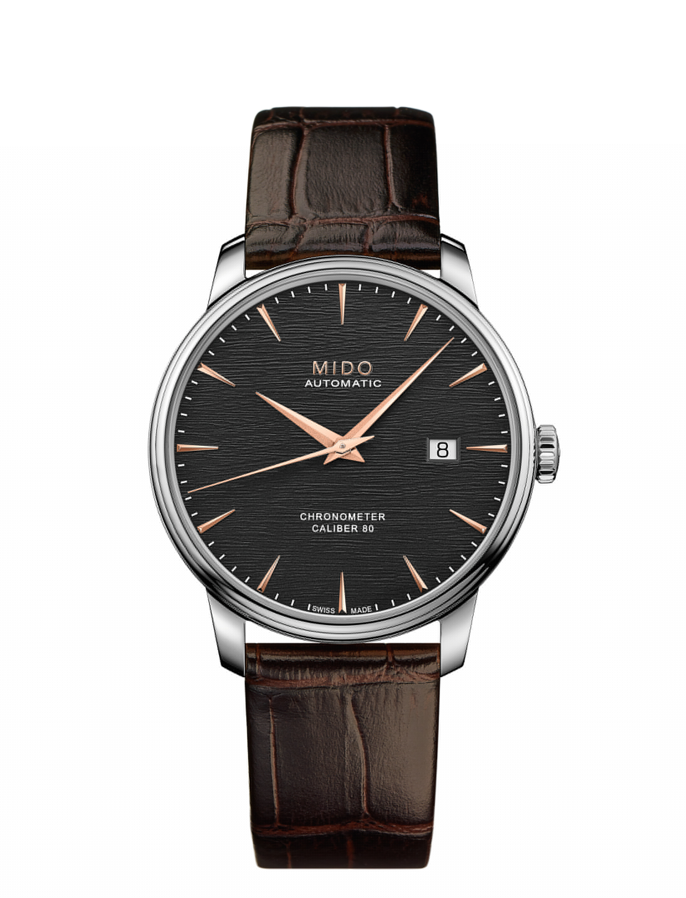 在蓝宝石玻璃的保护下,通过透明背底可清晰观测其精雕细刻的机芯,采用蓝色螺钉,自动摆陀装饰有日内瓦波纹和 MIDO标志。防水深度30米,并配有棕色小牛皮轧鳄鱼纹表带和不锈钢折叠表扣。