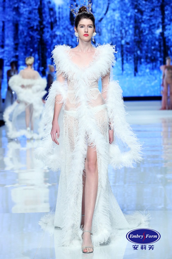 雪花晶莹剔透,漫天飞舞。自然四季的最后一站已经到达,一场冰雪世界的旅行在 T台上延展开来。 Liza Cheng这一季的礼服将细节肌理装饰与曼妙薄纱及性感蕾丝融合,闪