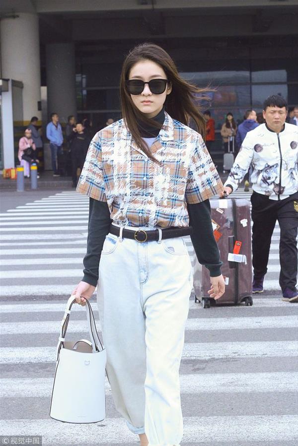 张雪迎机场街拍。黑色太阳镜遮面,身穿Burberry卡其色格子涂鸦印花短袖衬衫,内搭黑色立领长袖T恤,手拎白色Burberry水桶包,下穿水洗白宽松牛仔裤搭配黑色腰带。