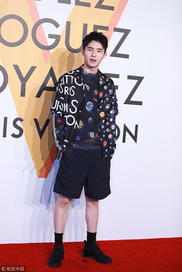 刘昊然,品牌:All in Louis Vuitton上装:衬衣,短袖,针织衫,长袖,不对称,星空图案,黑色,下装:百慕大短裤,鞋:运动鞋,配饰:堆堆袜。