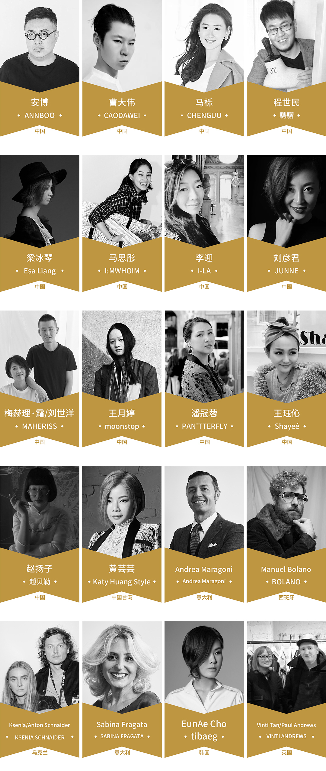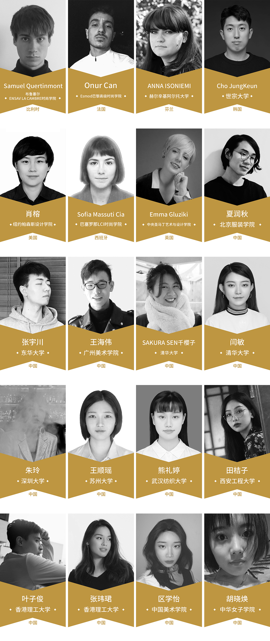 独立设计师名单中,包括来自中国的安博、曹大伟、马栎、程世民、梁冰琴、马思彤、李迎、刘彦君、梅赫理·霜/刘世洋、王月婷、潘冠蓉、王珏伈、赵扬子、黄芸芸;来自意大利的Andrea Maragoni、Sabina Fragata;来自西班牙的Manuel Bolaño;来自韩国的Eunae Cho;