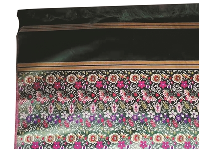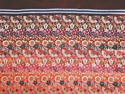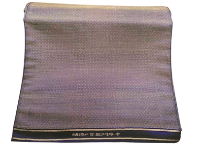 在此次展览中展出的几件精品广缎,都是上世纪60年代由故宫博物院调拨广博的,现在都是广博的重要藏品。对于这种手工产品,故宫博物院的官网上是这样说的:“广缎原产于我国广东省,其织造工艺与我国著名的南京云锦中的‘织锦缎’如出一辙。两者都是以多彩的纹纬粧彩提花,属重经重纬的高级丝织物,只是织物的花纹设计、颜色的配置及其艺术表现形式受地域文化的影响而有所不同。广缎的纹样设计方面,图案、花型一般较小、零碎,但花纹的轮廓、线条自然工整,繁而不乱。在配色方面,通常采用反差强烈的色彩,如大紫大绿相间,甚至采用更加鲜艳的颜色对比使用,十分炫耀夺目。作品大都富于渲染欢乐及热烈的气氛,具有浓郁的岭南风格。”