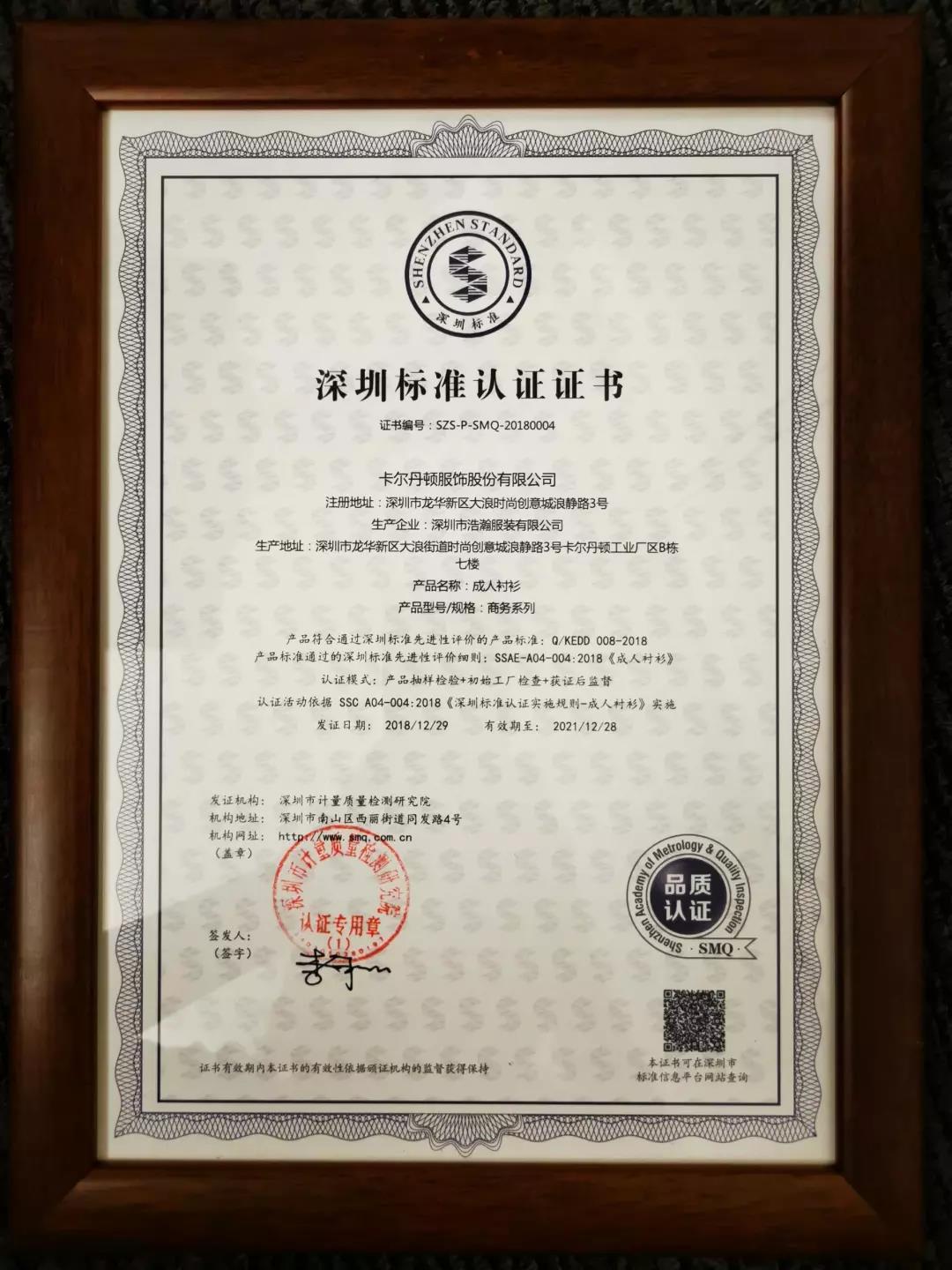 这次卡尔丹顿成人衬衫荣获2019年深圳标准认证,给现有的成人衬衫产品标准在清洁生产和健康安全环保指标上增加了更高的要求,具体体现在甲醛含量、色牢度、化学试剂、面料质量上提高了成人衬衫的标准门槛,相较于之前,更加注重消费者体验。而此次深圳标准认证也对成人衬衫产品的标准体系建设给出了具有全面的指导意义。