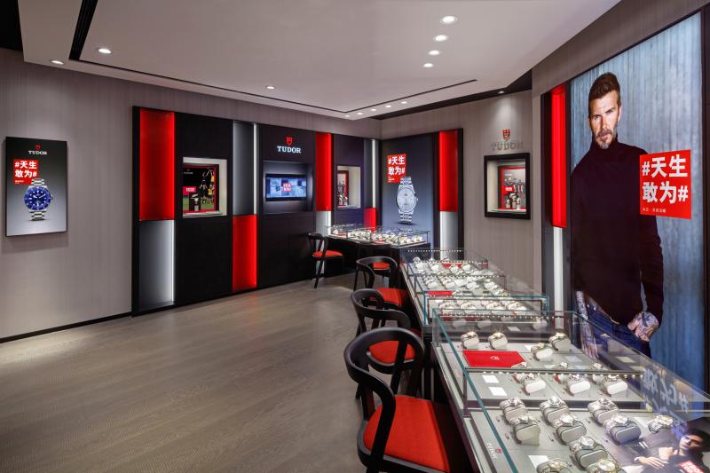 新店主色调保留了品牌经典的红黑灰三色,通过实木、亚克力、玻璃、金属等多种材质的丰富组合,打造出轻盈摩登与坚实稳重并存的店铺“性格”,一如现代都市人所追求的一体两面:尽享缤纷生活的同时亦心怀理想、敢于进取。黑色实木立柜与红色亚克力装饰墙以几何大面积色块的拼接方式呈现,店铺入口及灯箱立柱则采用红黑间隔线条设计,动感之中令人对未来都市充满想象。同时,大面积使用的浅米色墙面与精心调控的灯光,亦展现出帝舵表时尚酷感背后柔和细腻的一面,成为良好的视觉平衡。店内陈设也更趋简单明晰,柜台与家具亦经全新设计,在符合人体工学基础上,更具时尚线条感。