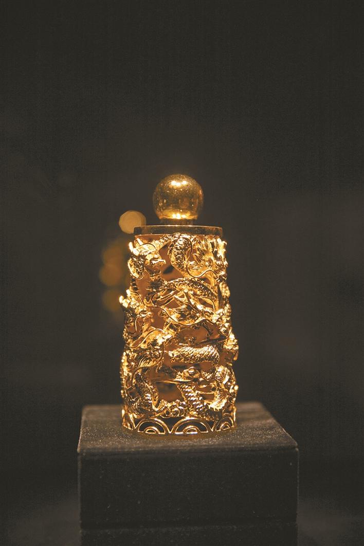 深圳珠宝博物馆的第二个展览则是今年10月13日举行的“东方之华—花丝镶嵌精品珠宝展”,展示花丝工艺历史、流程、花丝镶嵌精品等,亮点展品是末代皇帝溥仪的盘龙冠柱(仿制品)。王振介绍,这是成立于1895年的百年老字号企业萃华珠宝的前身萃华金店为末代皇帝爱新觉罗·溥仪承制,用于其登基时佩戴,此次展出的是根据原件1:1制作的仿制品,冠柱采用镂空雕刻工艺,通体九龙盘玉柱,堪称一代佳作。