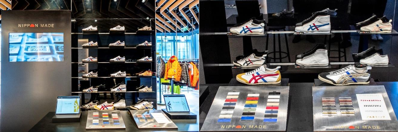 作为国内首家提供日本制手工系列「NIPPON MADE」服务的店铺,深圳万象天地旗舰店特别设立了「NIPPON MADE 」定制服务区域,传递日本纯粹的时尚态度。黑色镜面NIPPON MADE 鞋墙设计,道 具形式还原简单却不失格调,凸显日本高端手工制特点。该定制化服务的基本款是「MEXICO 66 DELUXE」,鞋面、Onitsuka Tiger 虎爪纹、内衬、鞋底、鞋带等各个位置都可实现定制化,此外也可以将英语、数字、符号等以刺绣的方式加入鞋的设计之中。顾客可根据个人喜好,定制属于自己的专属鞋 履。该定制鞋款的交货期为接受订单之日起 8 周左右。