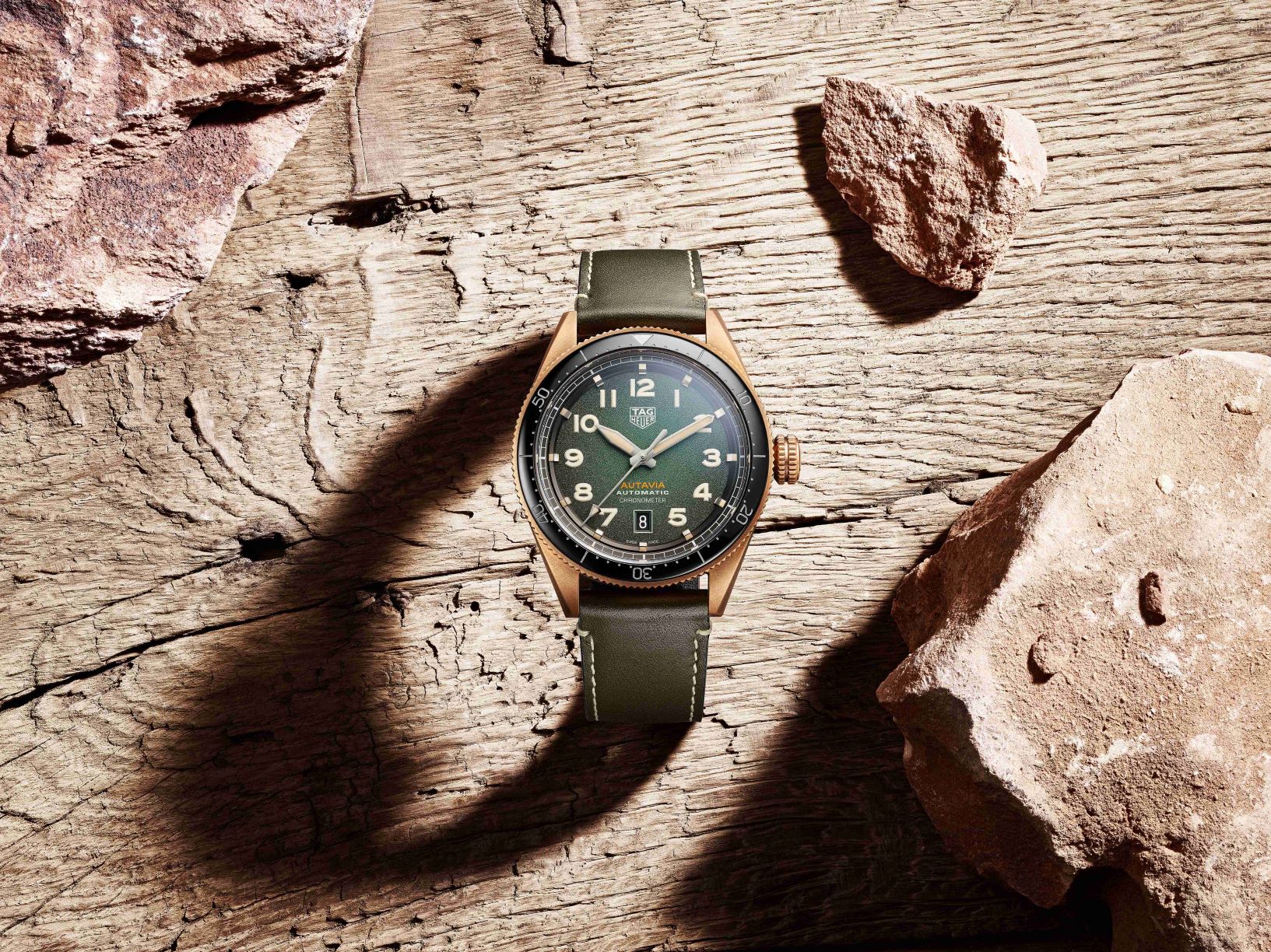 泰格豪雅这款时尚腕表的灵感源自驾驶舱,具有引人注目的独特元素,这些元素均植根于该系列的悠久历史。粉丝们对原版的钟爱之处——功能性、经典风格和众多功能组合——同样展现在这些时尚的全新表款中。特大尺寸表冠从使用超大型表冠的飞行员腕表和计时器中汲取灵感,即使配搭手套,同样能够轻松操作。最初的 Autavia腕表因其在任何条件下的清晰易读性而闻名,青铜款腕表亦是如此。时标和时、分、秒针均涂有 SuperLuminova®荧光涂料,即使身处漆黑的冒险旅途,依然能够读取时间。