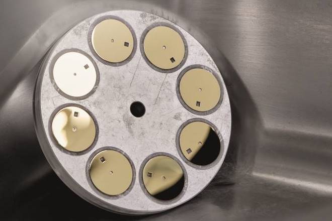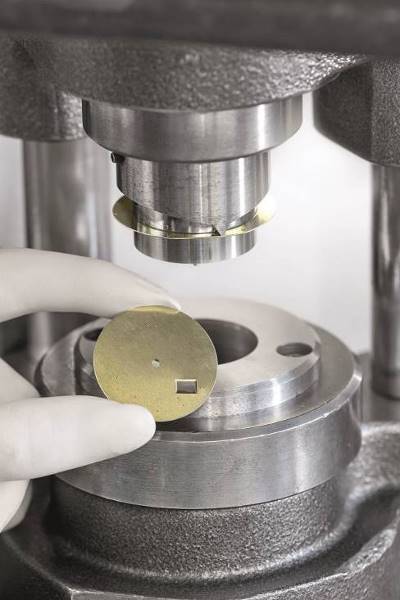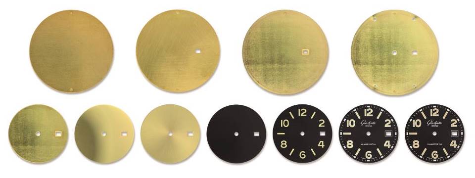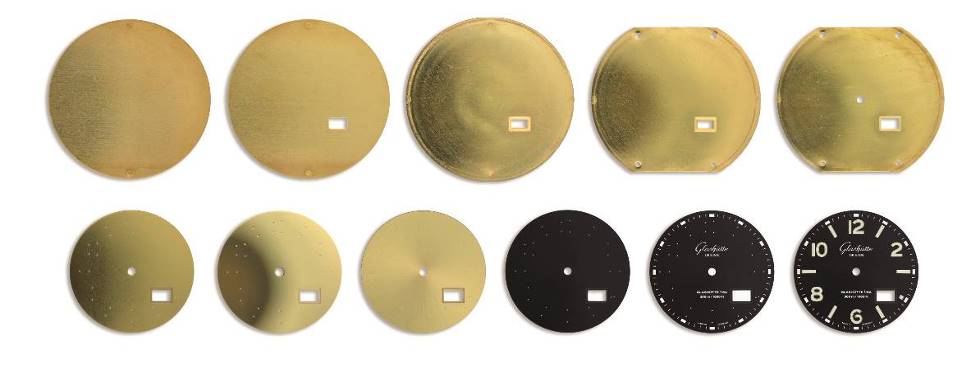 每一枚表盘的生命都从一块金属开始——坯体被渐渐赋予不同元素。SeaQ潜水表的表盘选用黄铜作为坯体。首先,在坯体边缘同时压入两枚螺钉,然后是四个卡孔——它们的作用是将表盘固定在接下来的加工程序点位中。接下来的步骤是制作日历视窗,继而在视窗周围压印装饰框。然后是插入中央孔洞,用作指针的旋转点。此外,SeaQ Panorama Date SeaQ大日历腕表的表盘上还会钻有几乎不可见的小孔,用于安装压嵌时标的小支脚,然后在背面焊接。完成了这些基本步骤后,表盘便脱离了坯体状态,直径也最终确定下来。