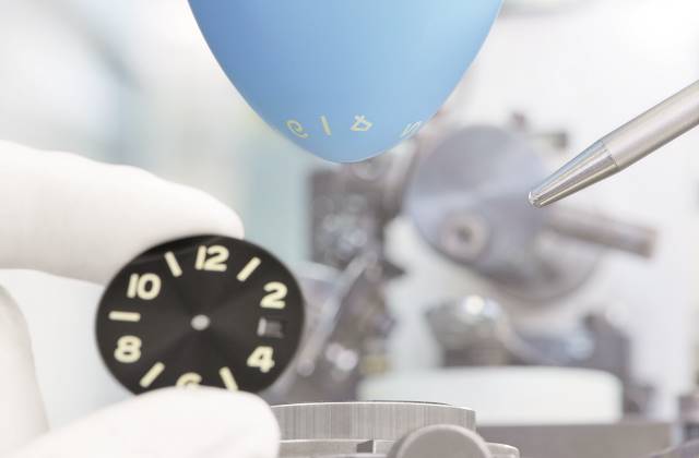 随之,便可给表盘“上色”——通过电镀工艺赋予表盘黑色或蓝色调,具体依表款而定。为了使同一表款的所有表盘具备一致外观和同等高品质,表盘匠人需要拥有非常丰富的实践经验,且须始终聚精会神、专心致志。电镀上色后,经清水冲洗的表盘便可装饰数字、时标、品牌标志、文字以及其他各种细节。