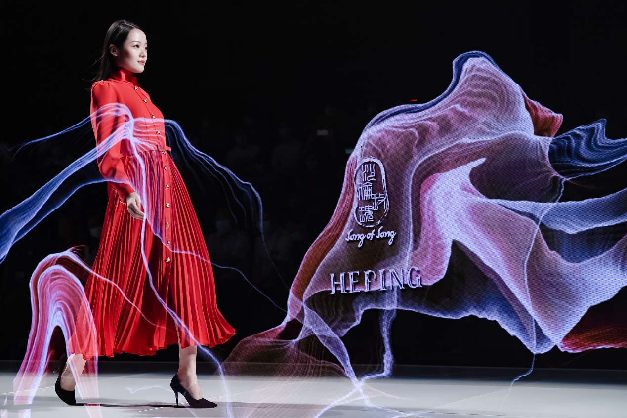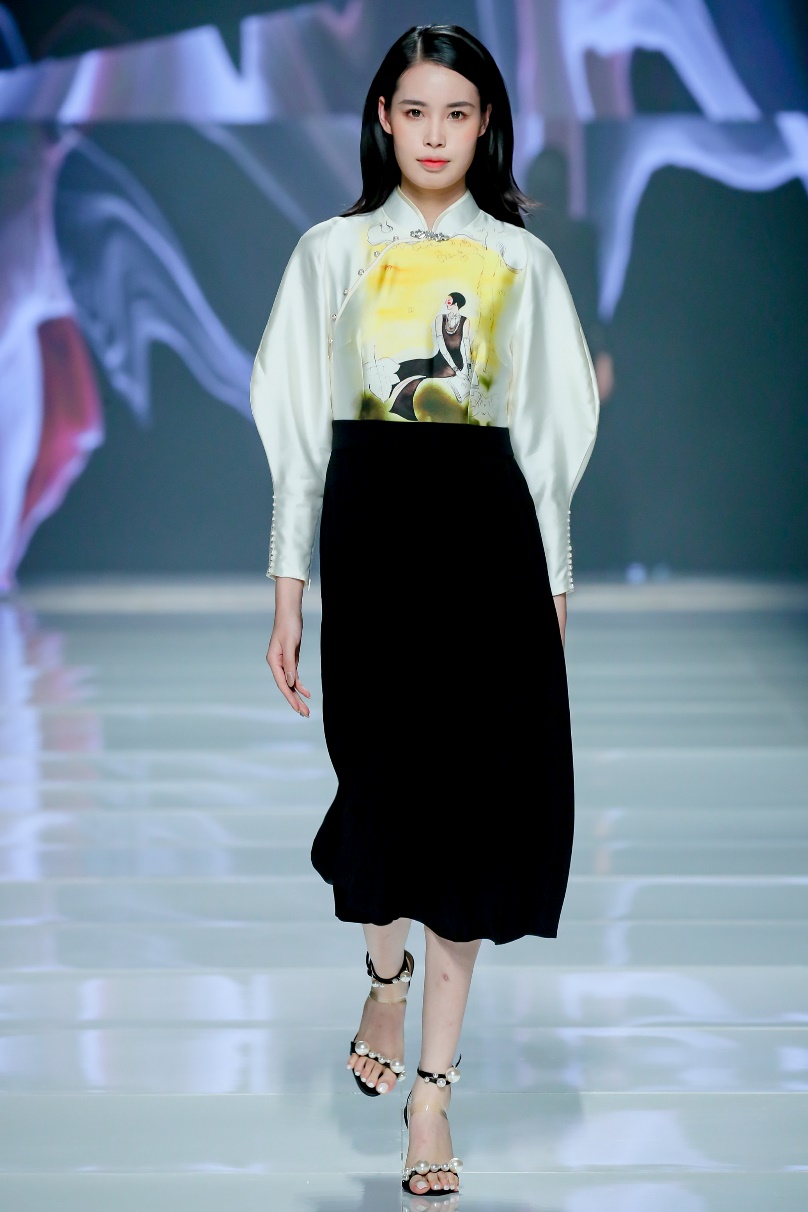 伴随着富有节奏感的音乐声,独立设计师黄芸芸与歌中歌的联名系列上场:经典中式立领、右衽大襟、古风盘扣,建筑花纹与现代装饰、立体剪裁、国际潮流廓形相结合,辅以明艳张扬的色彩,这一系列作品在设计师的巧手下迸发出中西合璧的独特魅力。