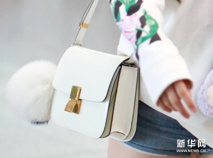 欧阳娜娜肩背Celine Classic Box白色单肩包,挂白色毛球挂饰。