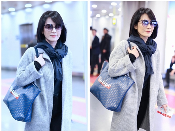 俞飞鸿身现身北京机场 背摩奈帆布手提袋趣味十足