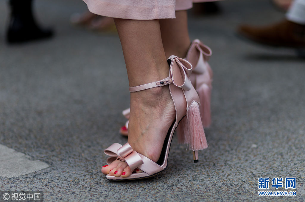 2016秋冬巴黎高定时装周:街头潮人(7月5日)。 粉色,流苏,蝴蝶结,鱼嘴,一字带,绑带,高跟鞋,凉鞋。(图片来源:视觉中国)
