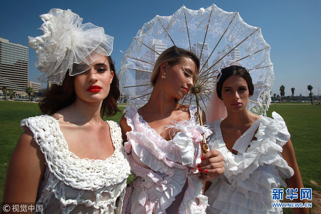 特拉维夫,模特身上穿着手纸制作的婚纱。9月9日是个大吉之日,大批新人将会在当日扎堆结婚。(图片来源:视觉中国)