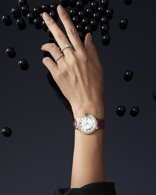值此Ballon Bleu de Cartier卡地亚全新蓝气球珠宝腕表于中国大陆全球首发之际,卡地亚特推出3种不同尺寸共6个型号的珍贵腕表供处于人生进阶的女性选择。卡地亚全新蓝气球珠宝腕表镶嵌明亮式切割圆钻,采用自动上链机械机芯。表壳及表冠为18K玫瑰金材质,表冠上镶嵌着一颗凸圆形蓝宝石。阳光射线纹饰效果的表盘上,剑形蓝钢指针平稳转动,在蓝宝石水晶表镜下划出时间的不朽轨迹。表带可选择亮面酒红色鳄鱼皮或18K玫瑰金款式,彰显非凡的时间魅力。