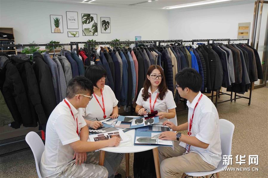 在位于无锡的江苏红豆国际发展有限公司,业务人员在和日本客户交流(8月24日摄)。1月到6月服装出口额4500万美金、同比增长约10%,海外客户订单排到了12月——对于这份半年“成绩单”,红豆集团常务副总裁、江苏红豆国际发展有限公司总经理戴敏君认为,仍有较大提升空间。 据她介绍,目前红豆外贸市场中欧洲占据半壁江山,美国约35%,日本为10%至15%。当前进入了出口旺季,下半年的情况会更好。 戴敏君说,现在国际贸易保护主义明显抬头,市场环境比较复杂,不过有信心应对,关键要“苦练内功”、继续提升研发能力。 新华社记者 季春鹏 摄