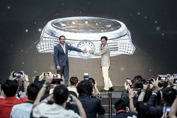 真力时全球首席执行官朱利安•托内尔先生与陈奕迅共同按动了大屏幕上的虚拟时计表冠