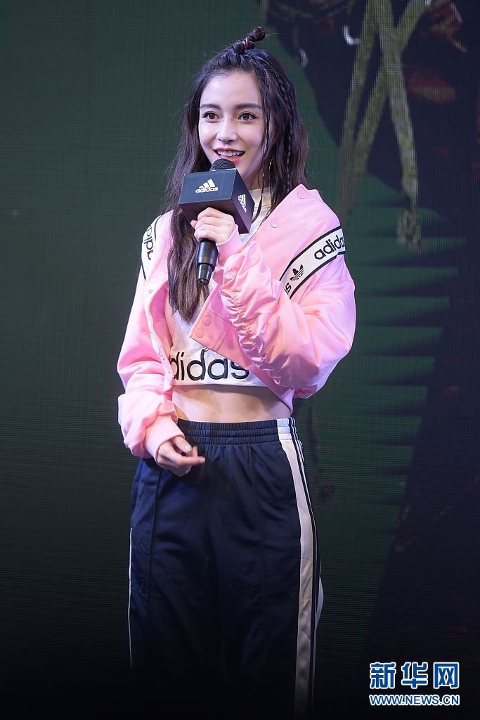 Angelababy粉色夹克+运动裤 梳苹果头娇俏