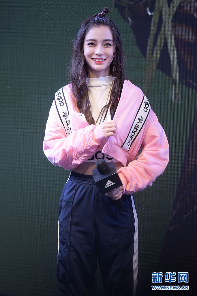 Angelababy粉色夹克+运动裤 梳苹果头娇俏