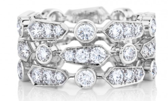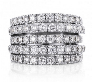| De Beers戴比尔斯Classic五行戒指 18K白金传递着经典而现代的时尚宣言。总重1.75克拉。密镶。戒指宽度:13 mm。 |