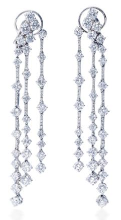 | De Beers戴比尔斯Arpeggia三层钻石耳环 特选圆形明亮式美钻镶嵌排列于18K白金底座之间,晶莹的钻石闪耀着颤动的光芒,既像悠扬的琶音,又像起舞的精灵。 |