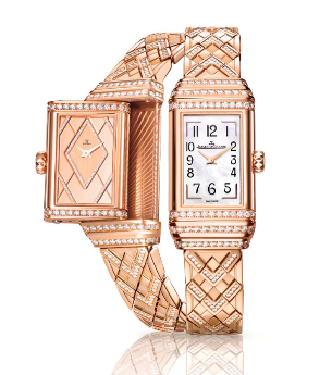积家 Reverso One Duetto Jewelry双面翻转系列珠宝腕表玫瑰金款糅合大工坊的高级珠宝与高级制表工艺,为女性呈献一款完美平衡艺术设计和功能性的珠宝杰作。此腕表从装饰艺术汲取灵感,长方形表盘、背面表盘的菱形图案,以及18K玫瑰金表链的设计,其线条细致修长,展现高雅的女性魅力。此外,表盘上、下均采用标志性的三道装饰刻纹,令这款可翻转的腕表更具特色。装饰艺术风格自诞生起一直引领时尚,历久常新。这款典范之作完美诠释了装饰艺术风格的简约设计哲学。