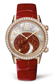 积家 Rendez-Vous Moon约会系列月相腕表玫瑰金款呈现奔放热情的迷人魅力,精致闪耀的表壳宛如一曲献给璀璨夜空的颂歌。腕表以无限诗意展现大工坊制表大师的精湛技艺,浩瀚缥缈的星空图案镌刻于腕表之上,令人沉醉。热情的火光色彩“铺满”玫瑰金表壳之上,紫红色砂金石表盘呈现北半球的浩渺苍穹。表盘和表壳均以钻石镶嵌,流光溢彩。珍珠母贝打造的一弯明月在浩瀚星空中缓缓移动,与显示数字时标的表盘采用相同工艺打造,散发皎洁光彩。一枚星形指针,以最富诗意的方式提示着佩戴者下一个约会的时间。