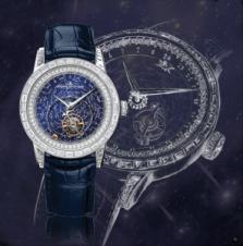 积家 Master Grande Tradition Tourbillon Céleste超卓传统陀飞轮大师系列星空腕表以让人目眩神迷的方式诠释时间。为了充分展现腕表的天文特性,轨道式飞行陀飞轮显示的为恒星时间而非太阳时间,比太阳时间缩短近四分钟。在这款腕表的表盘外沿,附带太阳标志的指针以24小时为一周在表盘上转动。表圈显示了24小时刻度、黄道十二宫星座与月份。轨道式飞行陀飞轮与星辰和星座同步运转,和表盘共演一段恒星之舞。