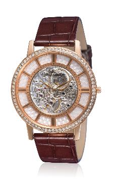 积家 Master Ultra Thin Squelette超薄大师系列镂空腕表镶钻款明确地将璀璨光泽视为设计主线。以不同方式镌刻和装饰一系列不同的腕表部件熠熠生辉,每个时区皆装饰一片手工雕刻的天然珍珠母贝,质感精致细腻。积家拥有悠久的超薄腕表制作传统,其历史可追溯至1907年。大工坊选择将镂空工艺、雕刻工艺、珐琅工艺及珠宝镶嵌等超凡的手工技艺与超薄制表技术相互结合,极具创意。