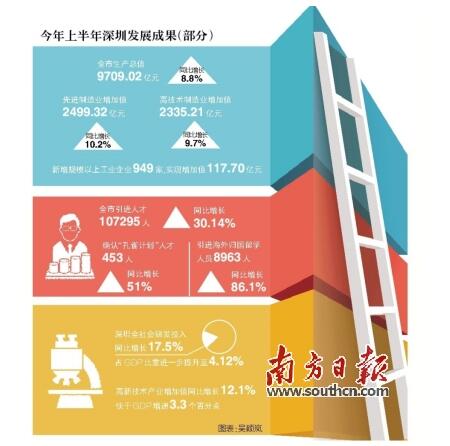 创新是深圳率先实现成功转型的亮丽名片,是深圳率先实现动力转换的制胜秘诀。如果说,作为特区,深圳之“特”过去更多地体现在政策探路,那么,现在则更多体现在转型创新。近年来,深圳经济特区把创新作为城市主导战略,先后制定了全国首部国家创新型城市总体规划和促进科技创新的地方性法规,出台自主创新“33条”、创新驱动发展“1+10”若干措施等一系列政策措施。经过多年不懈的努力,深圳创新驱动发展取得了积极成效,创新正加快向高端前沿迈进,从跟跑、并跑向领跑跃升。在创新的驱动下,深圳实现了新常态下动力转换和新一轮转型升级,保持了有质量、有效益、可持续的发展。事实为证:今年上半年,深圳全社会研发投入增长17.5%,占GDP比重进一步提升至4.12%;高新技术产业增加值增长12.1%,快于GDP增速3.3个百分点,呈现出“逐季攀高、质量提升、结构优化、动力增强、趋势向好”的鲜明特点。