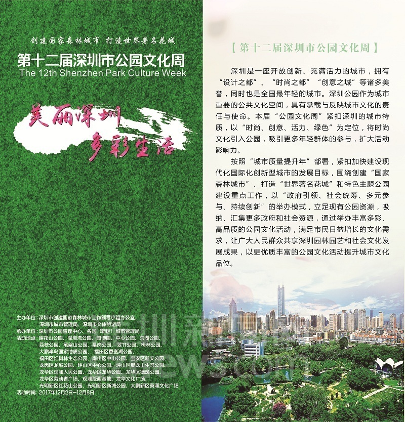 深圳新闻网12月1日讯(记者 钟鸿冰 通讯员 崔嵩)一年一度的公园文化节即将到来,12月2日-12月8日,2017年第十二届公园文化周将在全市27家公园举行。本届公园文化周紧密结合创建“国家森林城市”和打造“世界著名花城”重点工作,以“美丽深圳 多彩生活”为主题,充分展现美丽宜居的城市环境及丰富多彩的城市文化生活。