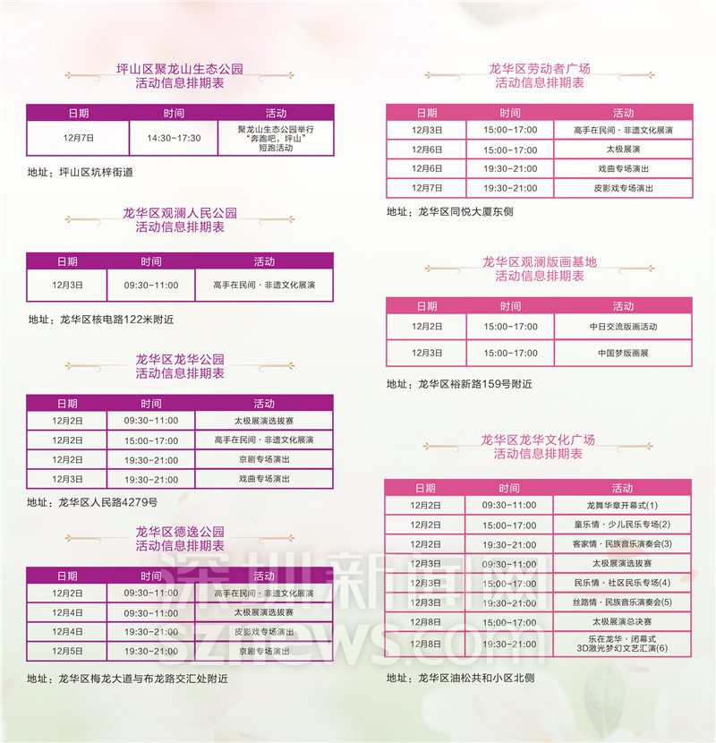 本届公园文化周共设27个会场,其中市属公园设11个会场,区属公园设16个会场,这也是公园文化周自举办以来承办会场最多的一届。其中,福田区首次参与公园文化周,该区红树林生态公园以及今年新开放的香蜜公园均参与了本次活动。此外,坪山区的聚龙山生态公园,龙华区的龙华人民广场、观澜人民公园、龙华公园、德逸公园、劳动者广场均是首次参与“公园文化周”的承办,让更多市民在家旁边就感受到公园文化和公园的建设成果。