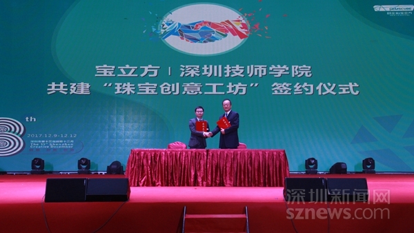 宝立方与深圳技师学院就“共建珠宝创意工坊”、“专业技能竞赛活动”举行了校企合作签约仪式