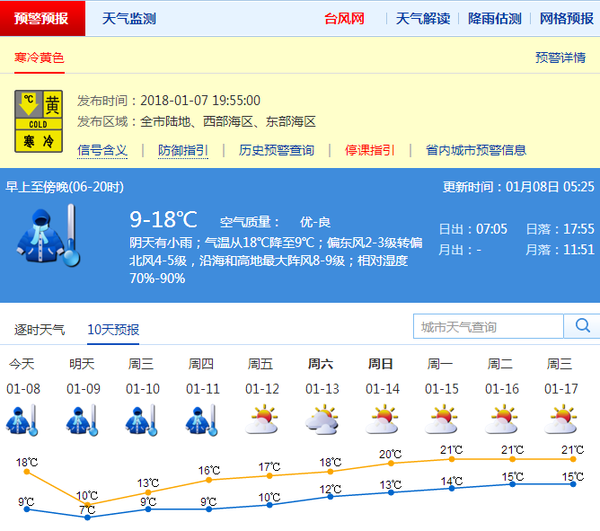 深圳新闻网1月8日讯(记者 何畅)据深圳市气象台8日5:25发布,深圳预计8-9日受强冷空气影响,阴天有小雨,气温逐渐下降,8日傍晚前后降至9℃,北风加大,沿海和高地最大阵风8-9级左右,9日最低气温降至7℃左右,北部及山区再低1-2℃;展望10日起雨停,转多云到晴,空气干燥,早晚寒冷。