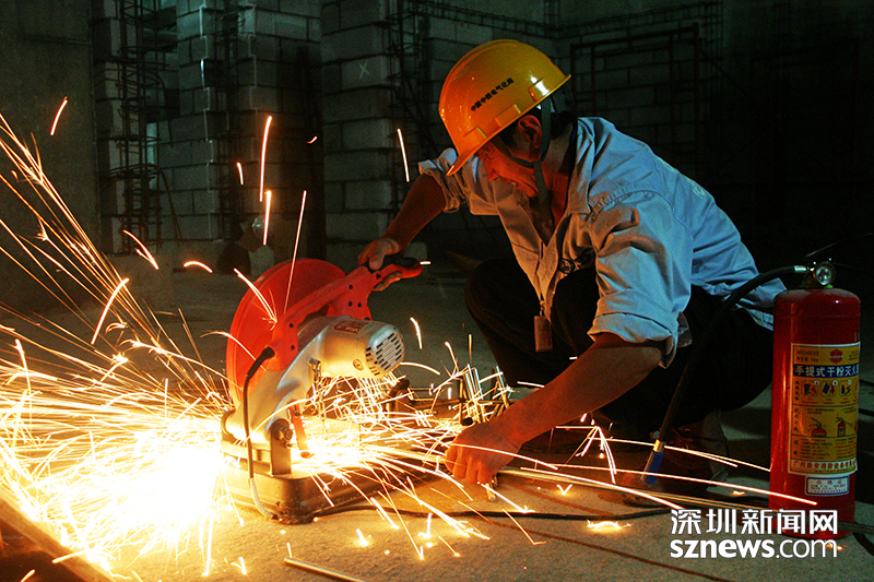 在地铁6号线大浪站,一名地铁工人正在进行材料切割,火花飞溅,旁边是干粉灭火器