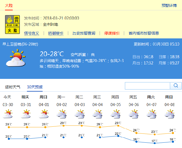 根据市气象局发布消息,本周末到下周初温暖舒适,无明显降雨:30日至4月4日多云间晴天,早晚有轻雾,空气较干燥,30日气温20-28℃;5日夜间至6日冷空气影响,有分散阵雨,北风加大,气温下降。近期无明显降水,需加强防火安全管理。