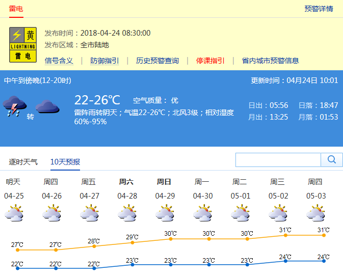 【深圳市雷电预警】深圳市气象台于2018年04月24日08时30分在全市陆地发布雷电预警,预计30分钟内全市将受雷电影响,按照防御预案停止户外易燃易爆危险作业,并加强危化场所安全管理。