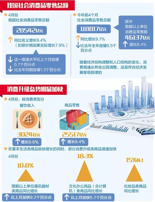 今年前4个月,社会消费品零售总额118817亿元,同比增长9.7%,比去年全年放缓0.5个百分点。其中,限额以上单位消费品零售额46137亿元,增长8.4%。
